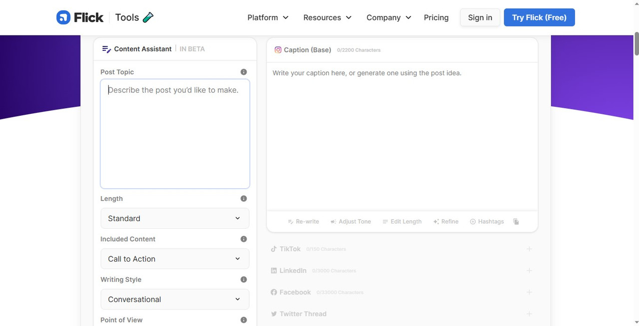 Flick is a top-notch caption generator for your social media posts. It generates engaging and on-brand captions for your business using parameters like the topic, point of view, writing style, and so on. This ensures that the captions are not just generic jargon returned by the AI.